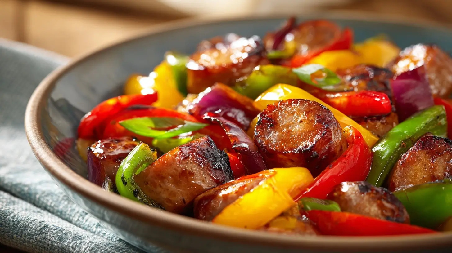 Delicious air fryer sausage and peppers dish with a colorful vegetable medley.